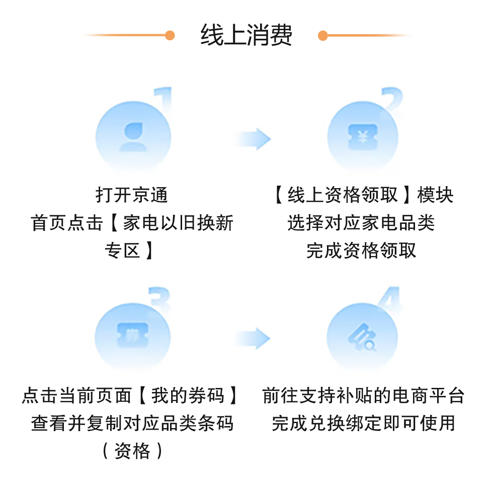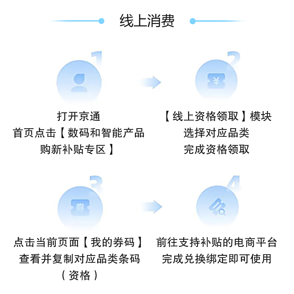 個人消費者領取補貼資格後,在北京市政策參與企業範圍內任選銷售企業的線上商城或線下門店消費使用。每類商品補貼資格在政策實施期間僅可領取並使用一次。補貼資格經商品購買渠道的資格認證係統綁定後,於訂單支付環節使用。