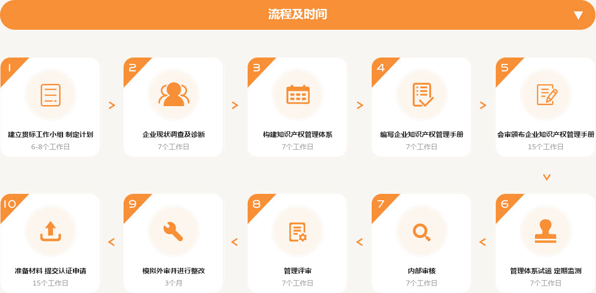 貫標輔導周期在3-4個月,認證周期2個月左右。出於企業的需要與工作安排,全程周期可適當壓縮,高效率的貫標進程離不開企業領導重視和各部門參與人員的高度配合。