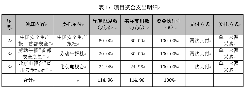《中國安全生產報》"首都安全"專欄的承擔單位為中國安全生產報社、《勞動午報》"首都安全之星"專欄的承擔單位為勞動午報社、北京電視台"直擊安全現場"的承擔單位為北京電視台。三項內容均為延續性項目,延續使用三個單位,合同預算資金規模延續,合同預算與年度預算編製一致,預算控製情況較好。