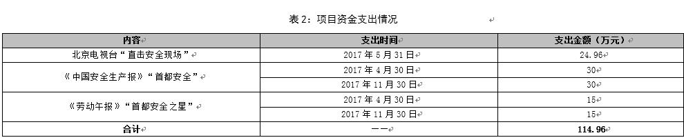 項目資金全部為委托業務費,截至2017年12月底,項目資金實際支出114.96萬元,無結餘。委托業務資金支付方麵,於2017年4月30日分別支付《中國安全生產報》"首都安全"專欄宣傳費和"首都安全之星"宣傳專欄宣傳費50%的首款;於2017年11月30日分別支付《中國安全生產報》"首都安全"專欄宣傳費和"首都安全之星"宣傳專欄宣傳費50%的尾款;於2017年5月31日支付北京電視台"直擊安全現場"宣傳費。三項委托業務資金按照委托合同約定支付方式、付款進度支出,資金落實情況較好。項目資金支出情況詳見表2。
