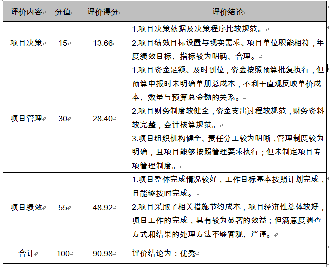 通過評價,項目綜合得分90.98分,項目綜合績效評定結論為"優秀"。根據對項目決策、管理和績效指標的計算,3個指標得分分別為13.66分、28.40分、48.92分,整體上,項目決策、管理和績效3個方麵完成情況較好,完成質量較高,但項目仍有提升空間,詳細情況見下表:
