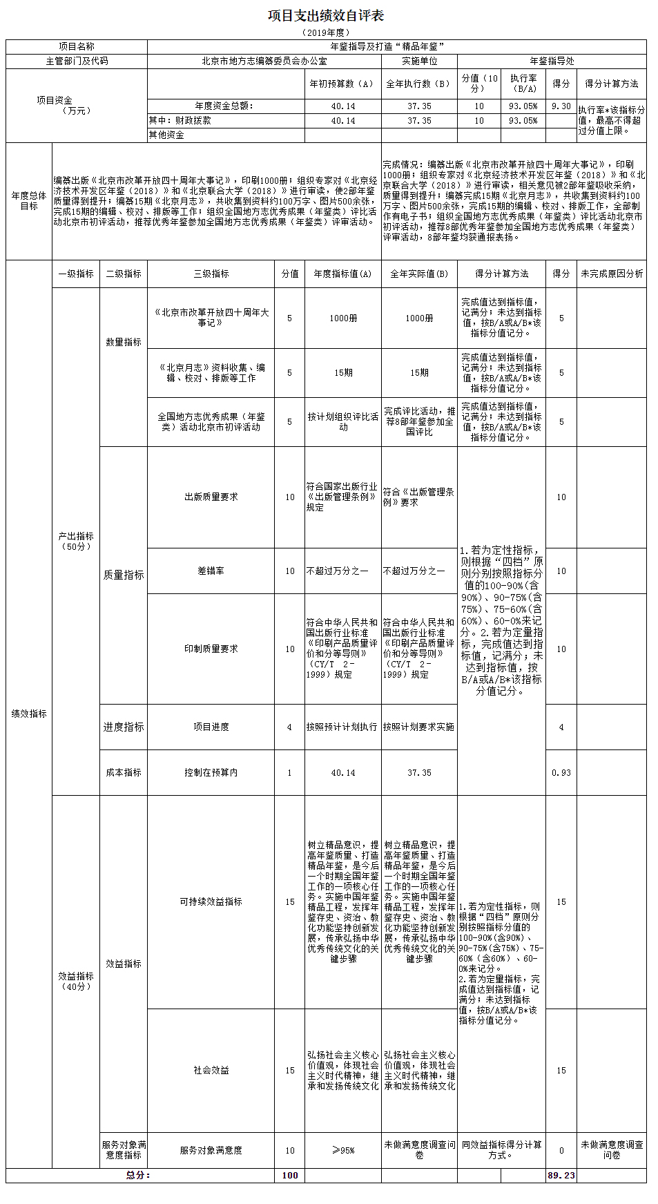 北京市地方誌編纂委員會辦公室對2019年度部門項目支出實施績效評價,評價項目2個,占部門項目總數的5.88%,涉及金額114.91萬元,占項目資金總數的13.57%。從評價情況來看,項目立項符合相關管理規定,績效目標較為合理,績效指標體係建設進一步完善,項目執行情況良好,基本達到預期績效目標。績效評價程序規範,評價指標體係合理。評價級別為評價級別為"良好"(90-75分)的項目2個。