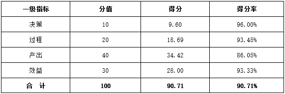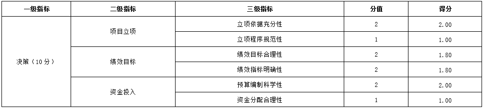 項目主要工作內容與相關政策規定、工委黨校工作重點和單位職能相符,項目設立符合市財政局預算申報要求,決策依據充分、程序規範,預算編製科學、資金分配合理。但績效指標不夠全麵,細化、量化程度有待進一步完善。該指標下設3個二級指標,6個三級指標,分值10分,得分9.60分,得分率96.00%,評分詳見附件。