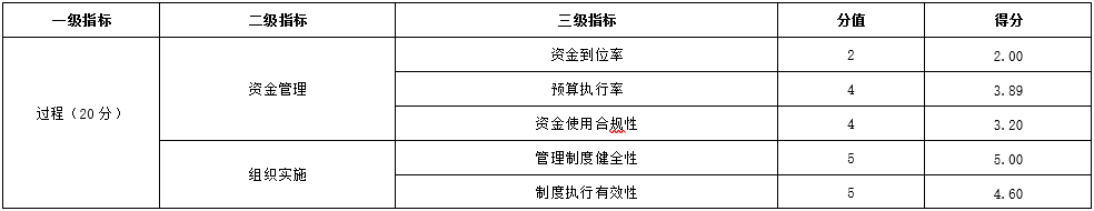 項目業務和財務管理製度健全,預算資金100%到位,預算執行率為97.32%,但項目資金使用和合同管理有待進一步規範。該指標下設2個二級指標,5個三級指標,分值20分,得分18.69分,得分率93.45%,評分詳見表3。
