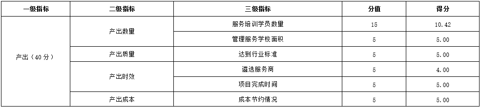 項目年度各項產出質量達標,項目實施過程中采取了一定成本節約措施,但受疫情影響,遴選服務商環節較預期進度有所滯後,部分培訓班次、人數減少,服務培訓學員數量未達到預期目標。該指標下設4個二級指標,6個三級指標,分值40分,得分34.42分,得分率86.05%,評分詳見表4。