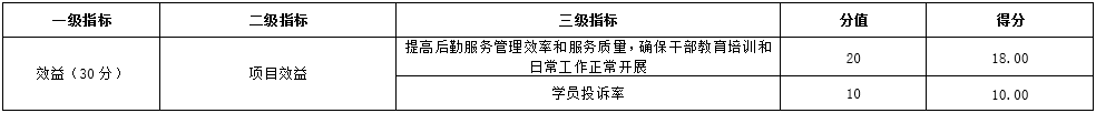 項目實施在提高後勤服務管理效率和服務質量等方麵取得了顯著效果,培訓學員對後勤服務保障工作開展的滿意度高,且年度內未收到投訴。該指標下設1個二級指標,2個三級指標,分值30分,得分28.00分,得分率93.33%。評分見表5。