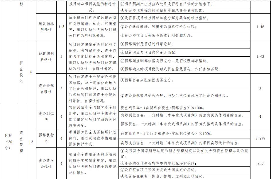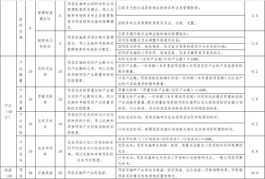 評價指標體係:主要包括項目決策、管理過程、項目產出、項目效益4個方麵,滿分100分。一是決策指標(10分),主要評價項目決策情況等內容;二是管理指標(20分),主要評價項目資金投入管理和使用情況、相關管理製度辦法的健全性及執行情況等內容;三是項目產出(40分),主要評價項目實現的產出情況;四是項目效益(30分),主要評價項目取得的效益情況。