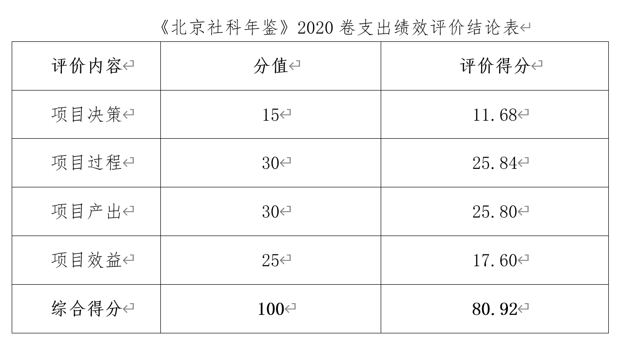 評價分析認為,該項目由於受到疫情影響,且項目團隊重新組建,工作進度有所延遲,未能實現2020年12月出版《北京社會科學年鑒》2020卷的預期績效目標。