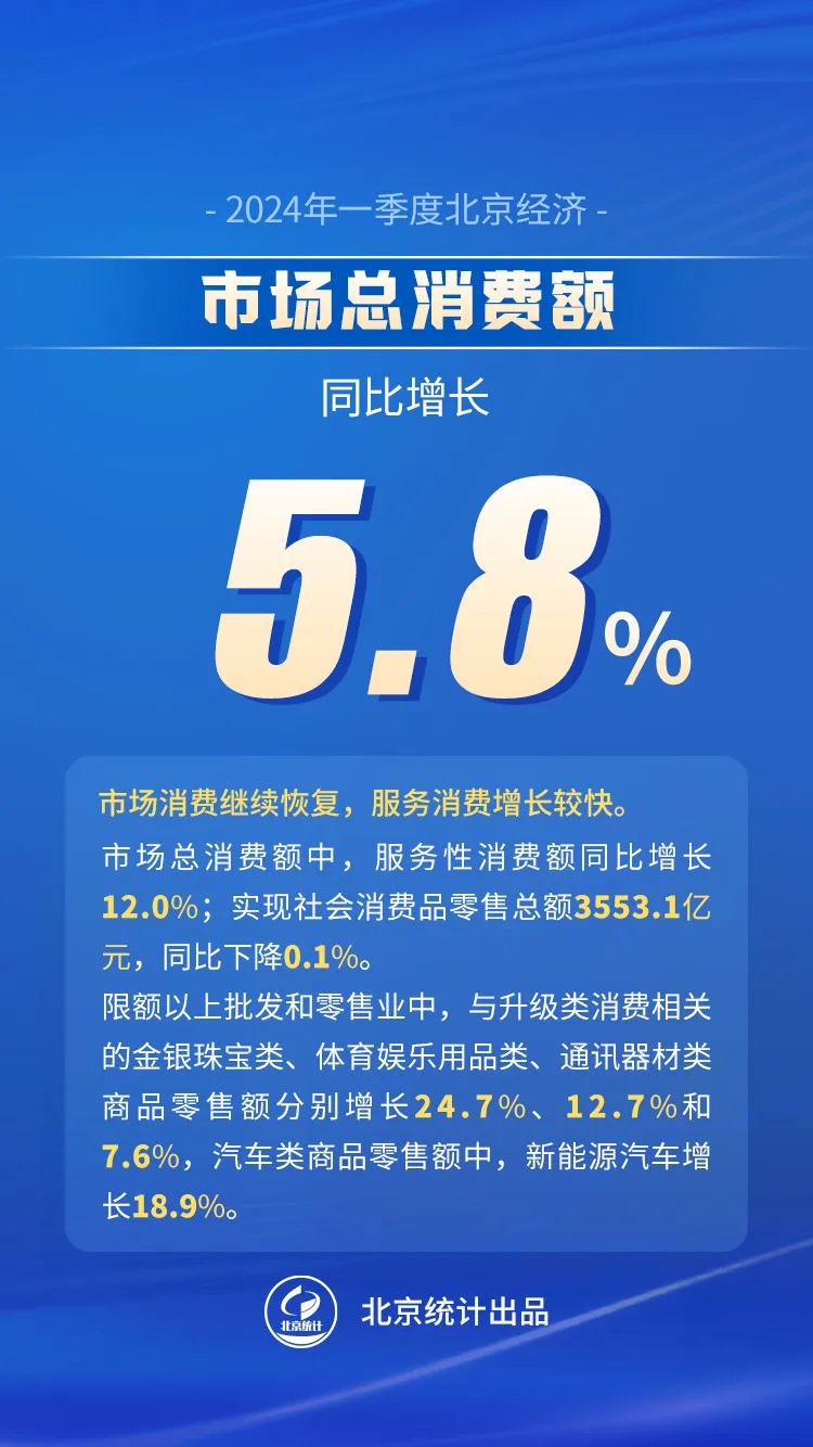 一季度,全市市場總消費額同比增長5.8%。其中,服務性消費額增長12.0%,文旅需求旺盛,交通、信息服務持續向好;實現社會消費品零售總額3553.1億元,下降0.1%。社會消費品零售總額中,按消費形態分,商品零售3235.0億元,下降0.2%,餐飲收入318.0億元,增長0.1%。按商品類別分,限額以上批發和零售業中,與升級類消費相關的金銀珠寶類、體育娛樂用品類、通訊器材類商品零售額分別增長24.7%、12.7%和7.6%,汽車類商品零售額增長2.3%,其中新能源汽車增長18.9%。