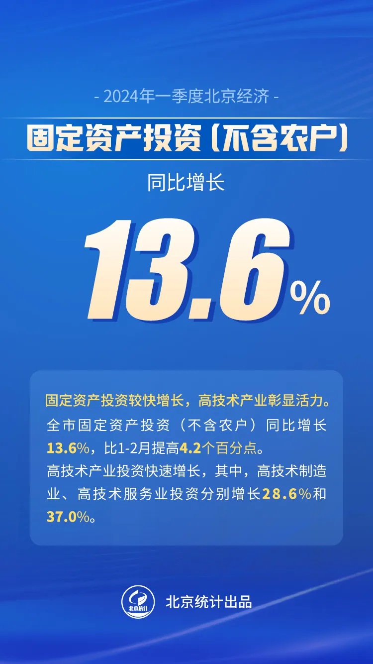 一季度,全市固定資產投資(不含農戶)同比增長13.6%,比1-2月提高4.2個百分點。其中,反映企業擴大生產能力的設備購置投資增長53.5%,反映實物工作量的建築安裝工程投資增長16.9%。分領域看,基礎設施投資增長25.2%,製造業投資增長15.0%,房地產開發投資增長2.0%。分產業看,第一產業投資下降54.3%,第二產業投資增長9.2%,第三產業投資增長14.5%。高技術產業投資快速增長,高技術製造業投資增長28.6%,其中,計算機、通信和其他電子設備製造業,專用設備製造業分別增長37.5%和9.5%;高技術服務業投資增長37.0%,其中,研發與設計服務、信息服務投資分別增長87.2%和55.0%。