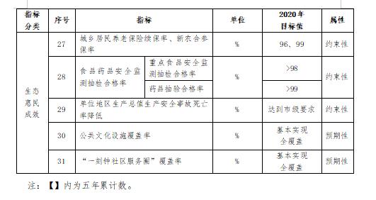 ——社會治理能力和水平有效增強。體製機製改革全麵深化,重點領域改革成效顯著。民主法治建設深入推進,依法行政水平、司法公信力不斷提高。綜合治理全麵加強,人口規模得到有效控製,城市管理更加精細智能,農村管理更加規範有序。社會環境更加穩定和諧,重點食品安全監測抽檢合格率大於98%,藥品抽驗合格率大於99%,億元GDP生產安全事故死亡率降幅達到市級要求。