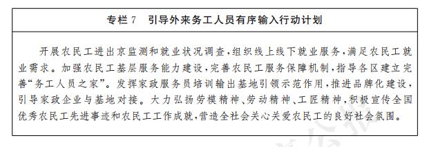 助力鄉村振興戰略促進農村勞動力就業。提高農民就業和社會保障水平,實施“六個一批”就業幫扶措施,引導參加企業職工養老保險,開展農村勞動力轉移就業幫扶行動,促進農村勞動力實現高質量就業。完善農民工就業培訓政策,加大家政服務、養老護理等從業人員培訓力度,加強就業服務和權益維護,提升就業質量。鞏固拓展脫貧攻堅成果同鄉村振興有效銜接,持續加強結對幫扶和勞務協作,推進家政服務輸出基地建設,發揮“務工人員之家”作用,進一步做好脫貧人口、邊緣易致貧人口穩崗就業工作。
