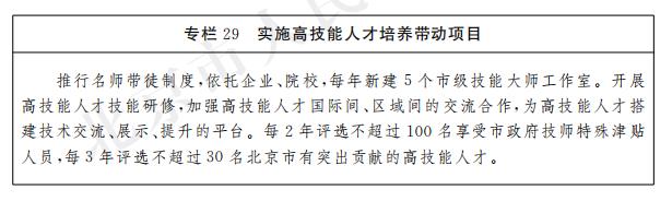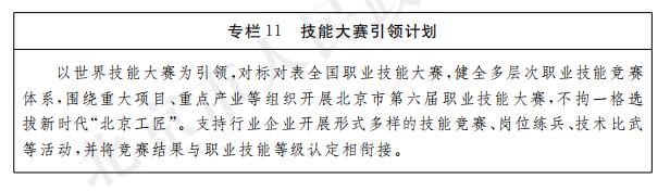 加快急需緊缺技能人才培養。擴大高水平技能人才有效供給,深化技工院校內涵建設,穩定技工院校招生規模。持續推進技師學院、公共實訓基地、高技能人才培訓基地等高技能人才培養示範集群建設,強化培訓資源優化整合。對標對表北京城市總體規劃,圍繞高精尖產業,城市運行保障和現代服務業等重點產業和重點領域,打造“四個一批”示範典型,培養一批具有示範作用的優秀技能人才,評選一批北京市有突出貢獻的高技能人才、享受市政府技師特殊津貼人員,依托企業、院校建設一批市級、國家級技能大師工作室,培育一批優秀技能人才培訓評價機構。建立技能人才與專業技術人才職業發展貫通機製,拓寬技能人才發展通道。開展高技能人才技能研修,加強高技能人才國際間、區域間的交流合作,為高技能人才搭建相互展示技能、技術交流、技能研發的平台。