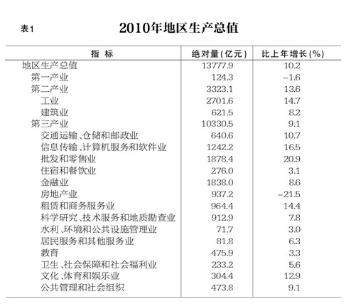 “十一五”期間,全市地區生產總值年均增長11.4%,低於“十五”時期平均增速0.7個百分點;其中三次產業年均分別增長1.4%、9.5%和12.3%。三次產業結構由2005年的1.3:29.1:69.6變化為2010年的0.9:24.1:75。