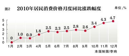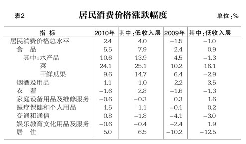 價格:居民消費價格漲幅低開高走,四季度明顯加大。10月份突破3%,11月份超過4%,12月份繼續走高,達到4.7%。全年居民消費價格比上年上漲2.4%,漲幅高於上年3.9個百分點。其中,低收入層居民消費價格上漲4%;食品價格上漲5.5%,非食品價格上漲1%;消費品價格上漲1.9%,服務項目價格上漲3.7%。