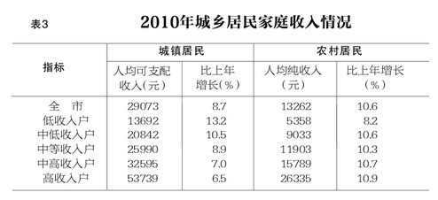 “十一五”期間,全市城鎮居民人均可支配收入年均實際增長9.2%,低於“十五”時期平均增速2.4個百分點。農村居民人均純收入年均實際增長9%,低於“十五”時期平均增速0.9個百分點。
