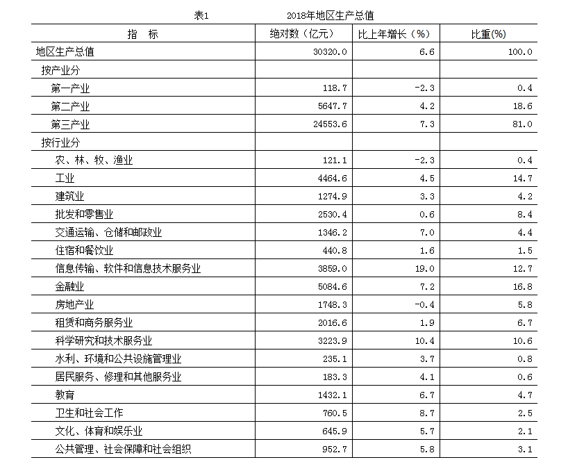 經濟增長:初步核算,全年實現地區生產總值30320億元,按可比價格計算,比上年增長6.6%。其中,第一產業增加值118.7億元,下降2.3%;第二產業增加值5647.7億元,增長4.2%;第三產業增加值24553.6億元,增長7.3%。三次產業構成由上年的0.4:19.0:80.6,變化為0.4:18.6:81.0。按常住人口計算,全市人均地區生產總值為14萬元。
