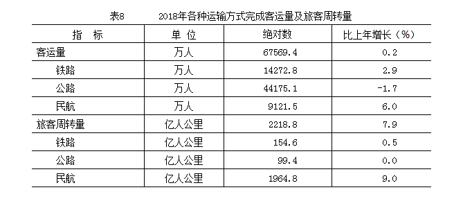 交通運輸:全年貨運量25244.1萬噸,比上年增長5.7%;貨物周轉量780.7億噸公裏,增長11.5%。全年客運量67569.4萬人,增長0.2%;旅客周轉量2218.8億人公裏,增長7.9%。