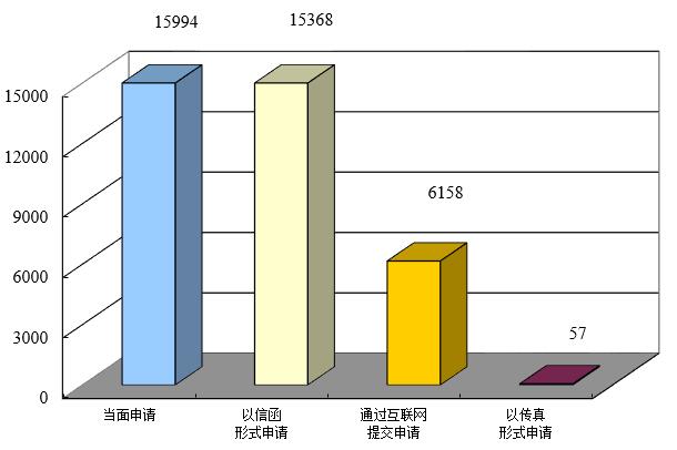 全市申請總數為37499件。申請方式中,當麵申請15994件,占總數的42.65%;以傳真形式申請57件,占總數的0.15%;通過網絡提交申請6158件,占總數的16.42%;以信函形式申請15368件,占總數的40.98%。(因同一申請可以多種申請方式提出,故分類申請之和大於申請總數。)