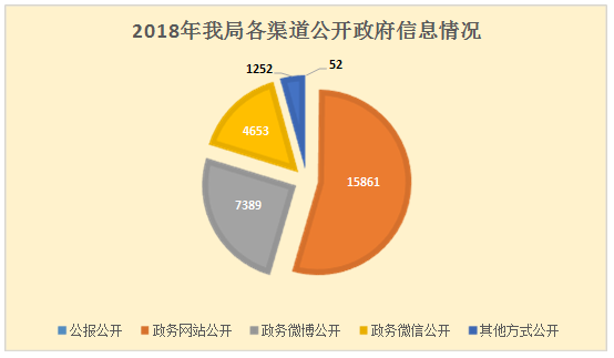 通過不同渠道和方式公開政府信息的情況,包括政府公報公開政府信息數52條;政府網站公開政府信息數15861條;政務微博公開政府信息數7389條;政務微信公開政府信息數4653條;其他方式公開政府信息數1252條。
