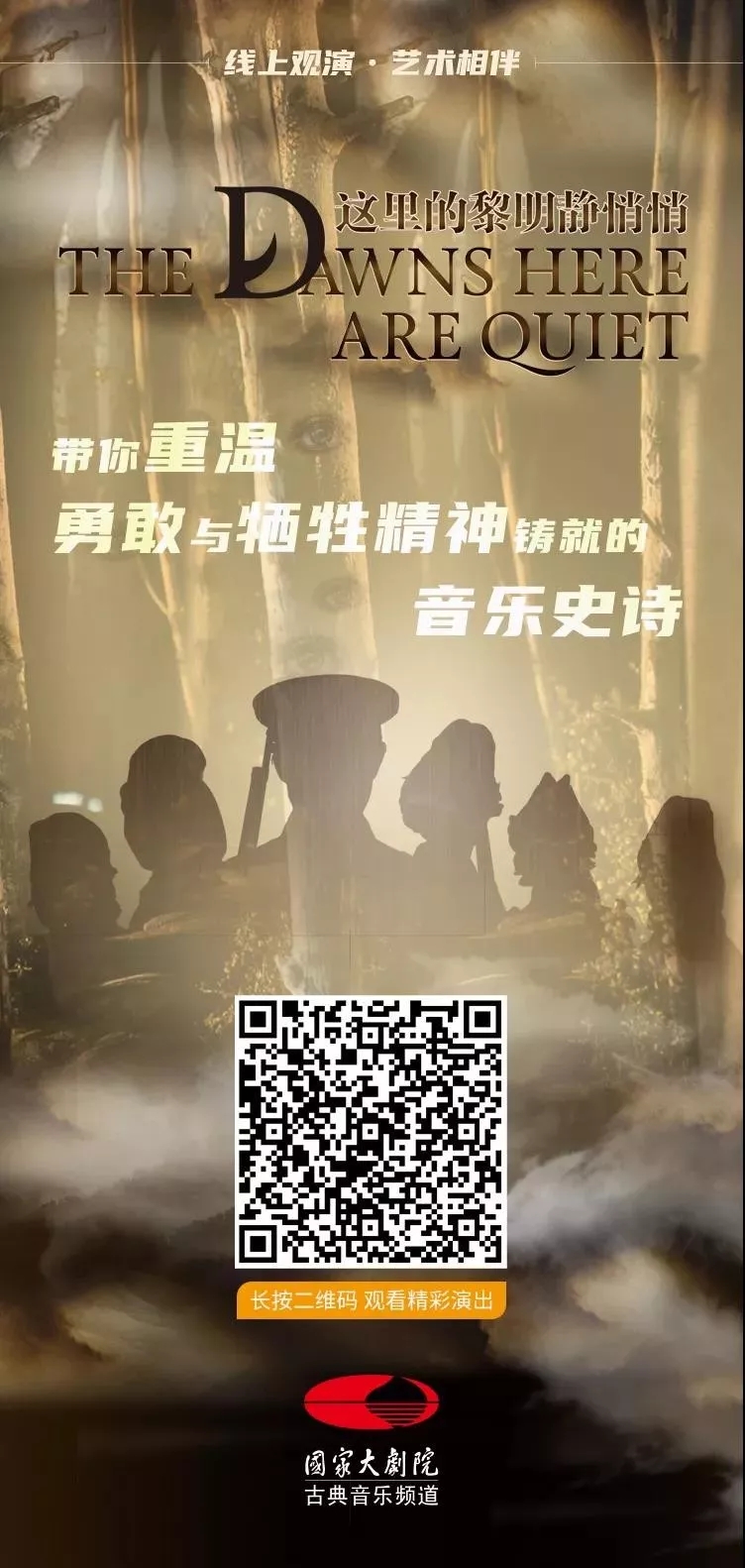 森林的神秘、沼澤的陰森、鋼盔的冰冷、戰火的炙熱……這是一個影響了幾代人成長的故事,是一個關於五位女戰士對和平生活和美好愛情執著向往的經典劇目。歌劇《這裏的黎明靜悄悄》是國家大劇院為紀念“世界反法西斯戰爭”勝利七十周年所作的中國原創歌劇。劇中年輕女兵們不同的人生軌跡、生活向往,以及消逝在戰鬥中永駐的青春,嚴酷的現實性與濃濃的人情味兒,碰撞出深掘人心的震撼性和感染力。在“喀秋莎”的樂聲中,你定會體味到那份感動!