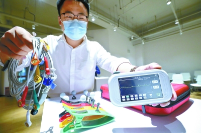 2020年4月14日,在中關村創客小鎮,入駐企業的員工展示自主研發的人工智能+全自動便攜心電圖機。這種設備曾無償捐贈給雷神山醫院、當陽市人民醫院等。截至一季度,在創客小鎮眾創空間辦公的485家企業中,437家企業已在獨立的人才公寓中通過線上辦公方式複工,複工率達90%。(饒強)