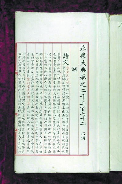 眼前這冊《永樂大典》與程有慶在國圖地庫中看到的《永樂大典》一模一樣。袁女士這冊《永樂大典》是“模”字韻的“湖”字,內容是與“湖”字有關的部分。此前,國圖已經收藏了兩冊“湖”字單冊,在程有慶印象中,中間正好缺這一冊。不過為了保險起見,他立刻打電話給曾在中華書局工作的父親,請他幫忙查一下已發現《永樂大典》的存目。
