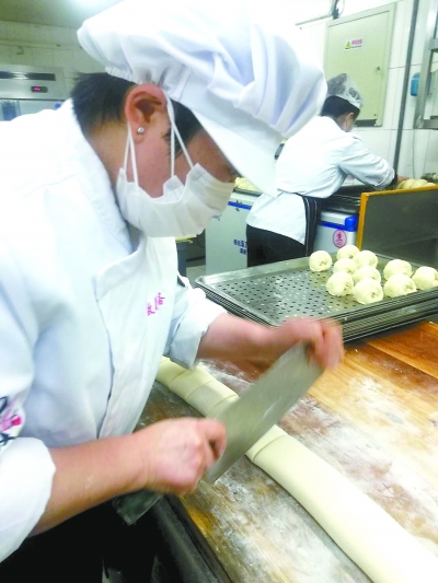 穿上消毒服,給庫房辦公室和所有庫房進行消毒,再換上白大褂,到麵點、冷葷等加工間取貨並記錄,成了李欣每天一早到工作崗位後的第一件事。在加工間裏,李欣要分別對幾千個饅頭和豆包、幾百份小吃和熟食貼封條、填寫生產日期,再運送到外賣部進行銷售。每天單是補貨,她就要來回跑上二三十趟。