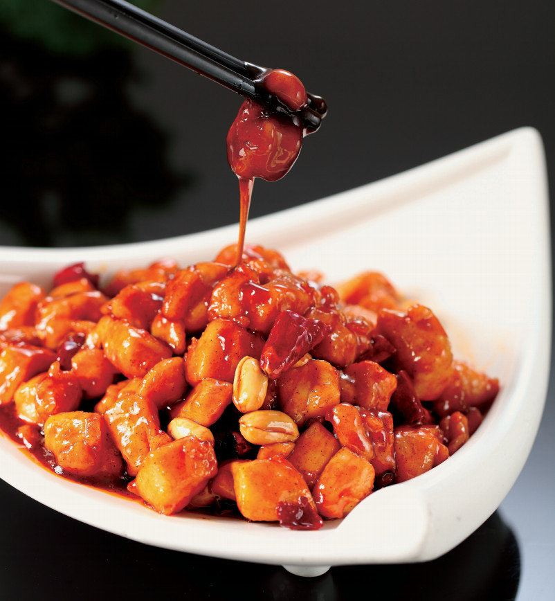 宮保雞丁色澤棕紅,甜、酸、鹹、辣、麻五味迭出,先甜後微酸,略有椒香,鹹鮮中還稍帶點麻口