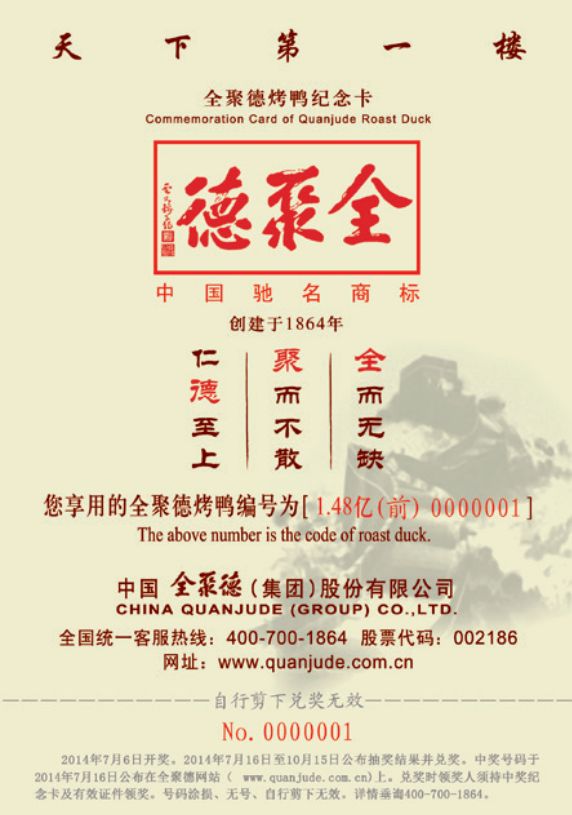 全聚德的每隻烤鴨和主要原材料都由公司統一配送,每隻烤鴨都配有獨一無二的“身份證”