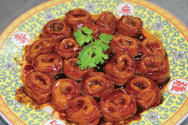 九轉肥腸菜色紅潤,質地軟嫩,香甜酸辣鹹五味俱全