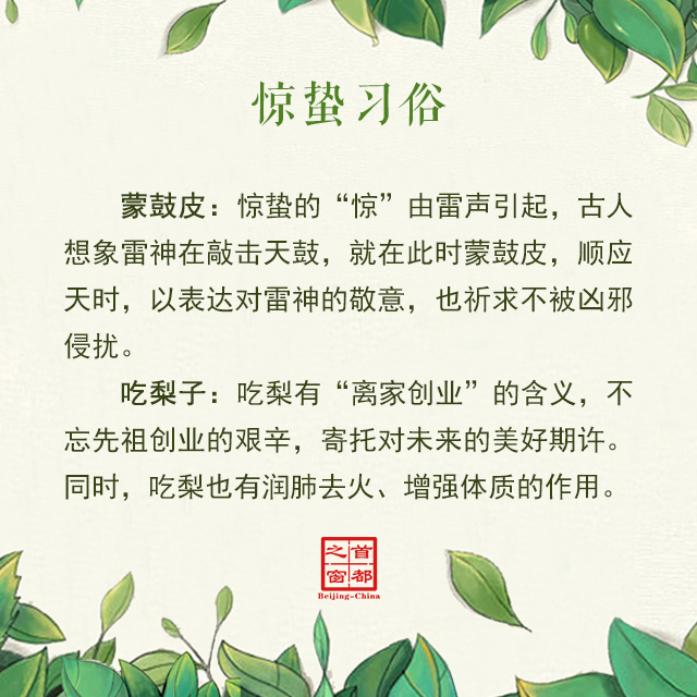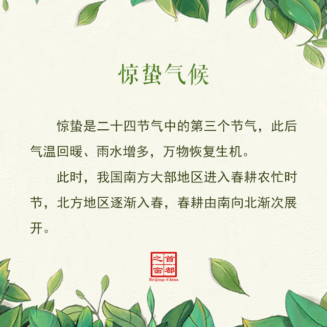 驚蟄,古稱“啟蟄”,是指此時天氣回暖,春雷始鳴,蟄伏於地下冬眠的昆蟲被驚醒而四處遊走,時值每年3月5日、6日之間,今年在3月5日。元代吳澄所著《月令七十二候集解》中記載說:“二月節,萬物出乎震,震為雷,故曰驚蟄。是蟄蟲驚而出走矣。”實際上,昆蟲是聽不到雷聲的,大地回春,天氣變暖才是它們結束冬眠、“驚而出走”的原因。