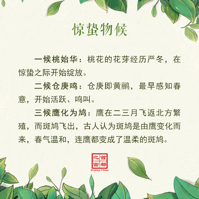 在我國古代,驚蟄被分為“三候”。一候桃始華,二候倉庚鳴,三候鷹化為鳩,以自然現象生動描述了驚蟄期間桃花紅、黃鶯叫、燕飛來的初春景象。