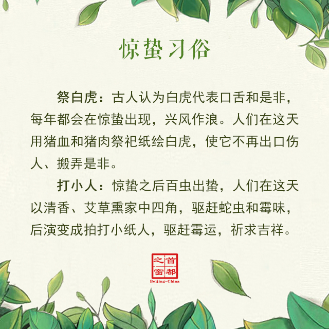 驚蟄過後萬物複蘇,是春暖花開的季節,卻也是各種病毒和細菌活躍的季節。“春雷驚百蟲”的結果可能是多種病蟲害的發生和蔓延,所以古時驚蟄當日,人們會手持清香、艾草,熏家中四角,以香味驅趕蛇、蟲、蚊、鼠和黴味,甚至漸漸演變成不順心者拍打對頭人和驅趕黴運的習慣,也就是民間習俗的“打小人”。在民間還有“驚蟄吃梨”的習俗,寓意災病遠“離”。全國各地在驚蟄這天也有著多種多樣的飲食風俗。在山東的一些地區,不少農家要在庭院之中生火爐烙煎餅,意為煙熏火燎殺死害蟲,莊稼能順利生長而喜獲豐收。在陝西的一些農村,人們於驚蟄這天會用鹽水浸泡並晾幹後的黃豆放在鍋中爆炒,使之發出“劈啪”之聲,象征蟲子在鍋中受熱被煎時的蹦跳之聲,然後全家食用炒熟的黃豆。在廣西的瑤族,驚蟄之日家家戶戶則要吃炒玉米,名曰“吃炒蟲”,“蟲”炒熟後,放在廳堂中,全家人圍坐一起大嚼大吃,還要邊吃邊喊:“吃炒蟲了,吃炒蟲了!”盡興處還要比賽,誰吃得快、嚼得響,大家就來祝賀他為消滅“害蟲”立了功。