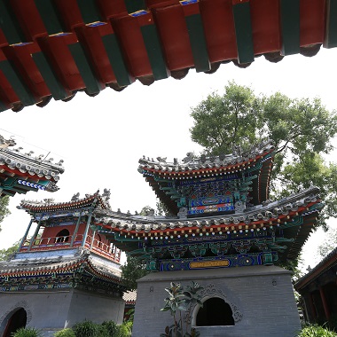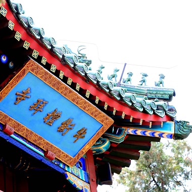 牛街禮拜寺,是回族伊斯蘭建築,居北京四大清真寺之首。牛街清真寺的總平麵布局很有特點。寺在牛街東側,大殿必須坐西向東,入口就隻能設在殿的後麵。寺門以望月樓代替,樓前有木牌樓三間,隔街為照壁,以強調入口。