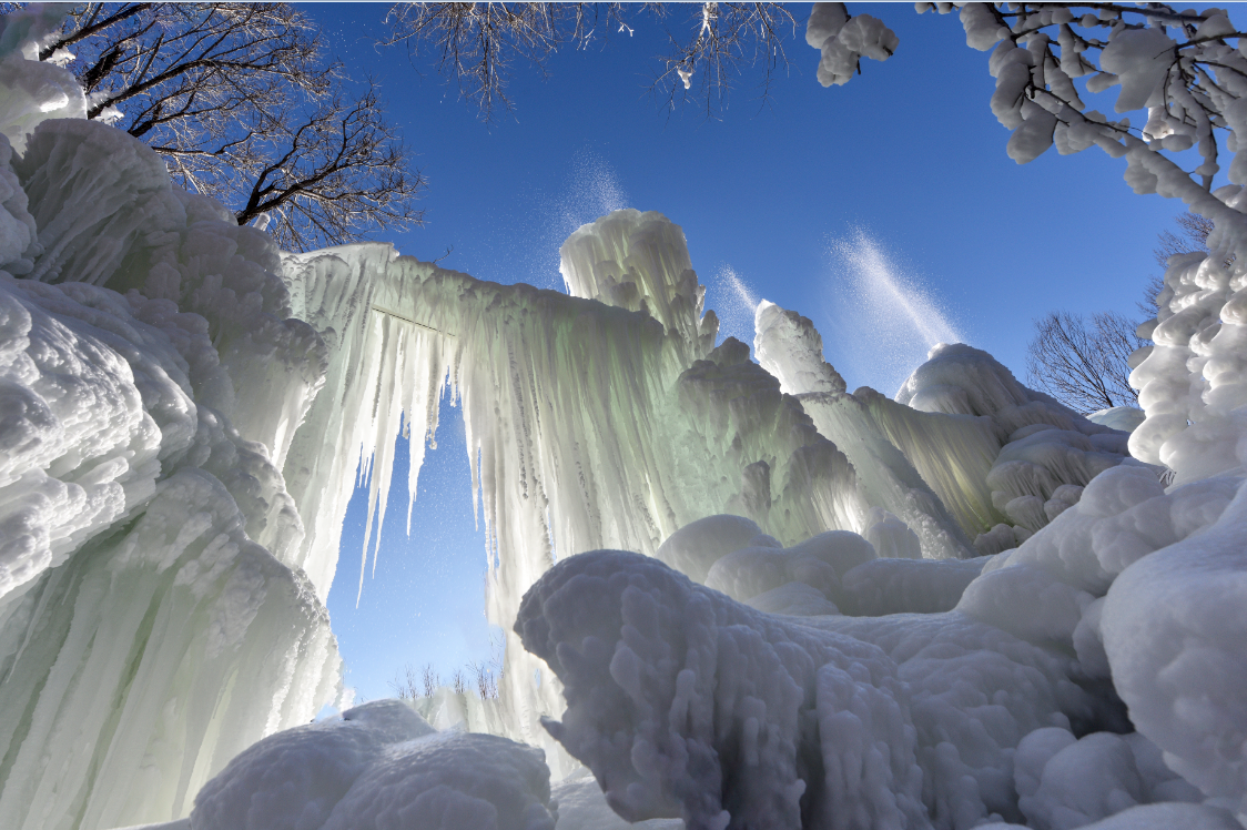 玉渡山冰雪大世界自然天成,既有雄渾壯美的林海雪原,又有千姿百態的冰幔冰掛,繪畫成一幅極致震撼的冰雪畫卷。