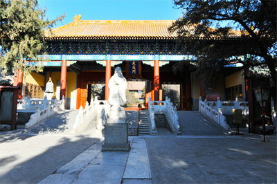 北京孔廟,始建於公元十四世紀的元朝。元世祖忽必烈定都北京後,為了加強思想統治,籠絡漢族的封建貴族和士大夫,下令襲曆代舊典,命宣撫王楫於金樞密院建宣聖廟,祭祀孔子。據《元史·哈刺哈孫傳》:“京師久闕孔子廟,而國學寓他署,乃奏建廟學。”至了1302年(元成宗鐵木耳大德六年),在今址正式建廟,於1306年(大德十年)建成。根據“左廟右學”的禮製,同年在孔廟西側,建國子監,又稱太學。1307年特詔命孔子加諡為“大成至聖文宣王”,這塊“加號詔書”石碑,現仍聳立在大成門前。1331年(元文宗至順二年),皇帝下詔恩準孔廟配享宮城規製,許孔廟四隅建角樓。元末,孔廟荒廢。1411年(永樂九年),又重新整治,並修繕了大成殿。1429年(宣德四年)修整了大成殿及兩廡。1530年(嘉靖九年)為祭祀孔子五代先祖,增建崇聖祠。1737年(乾隆二年)皇帝親諭孔廟使用最高貴的黃琉璃瓦頂,隻有崇聖祠仍用綠琉璃瓦頂。這時的孔廟已是紅牆黃瓦,金碧輝煌了。到了1906年(光緒三十二年)祭孔的禮節升為大祀,孔廟也大規模地修繕。工程尚未完成,清朝被推翻,但修繕仍繼續進行,到了1916年才最後竣工。至此孔廟形成了今天的規模和布局。