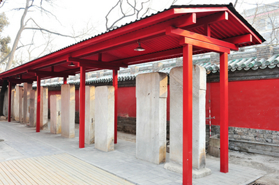 孔廟占地22000平方米,有三進院落。中軸線上得建築依次為先師門、大成門、大成殿、崇聖祠。前院東麵有碑亭、神廚、省牲亭、井亭;西麵有碑亭、致齋所,並有持敬門與國子監相通。兩側排列著198座元、明、清三代進士題名碑,刻有51624名進士的姓名、籍貫、名次,是研究我國科舉製度的珍貴實物資料。大成門外有乾隆石鼓和與之有關的兩座清代石碑。中院的主要建築為東西廡和13座禦碑亭;後院崇聖祠獨立成院,集合成北京孔廟完整的古建築群體。
