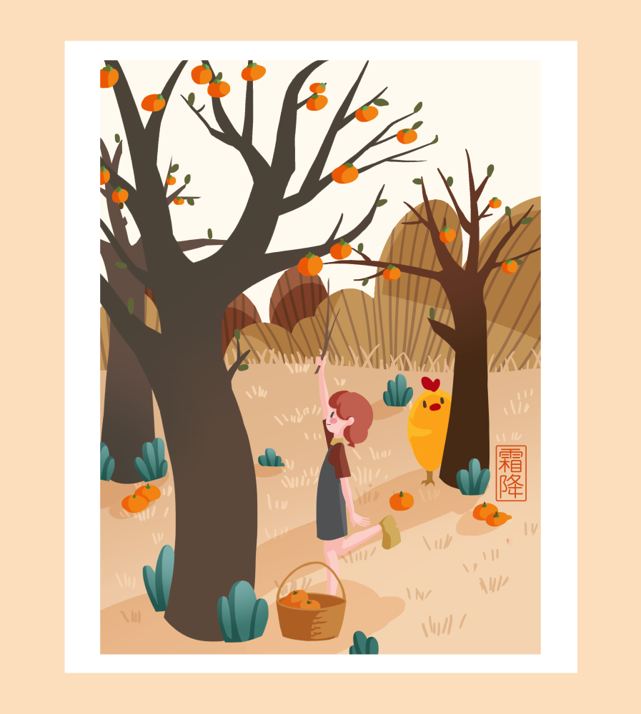 霜降節氣主要有賞菊、吃柿子、登高遠眺、進補等風俗。(作者:雪娃娃童畫)