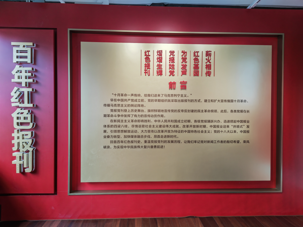 其中,“百年紅色報刊”專題展分別陳列於四個展廳,劃分為“萌芽”“誕生”“燎原”“長征”“抗戰”“決勝”“解放”及“偉大複興”等八個部分。