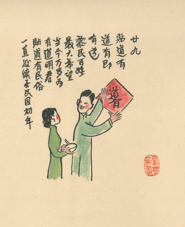 二十九,貼道酉。就是把酉字倒貼。因“倒”字欠節日喜慶氣氛,故民間將“倒”以“道”替代,“倒酉”成了“道酉”。(作者:李濱聲、陳惠展)
