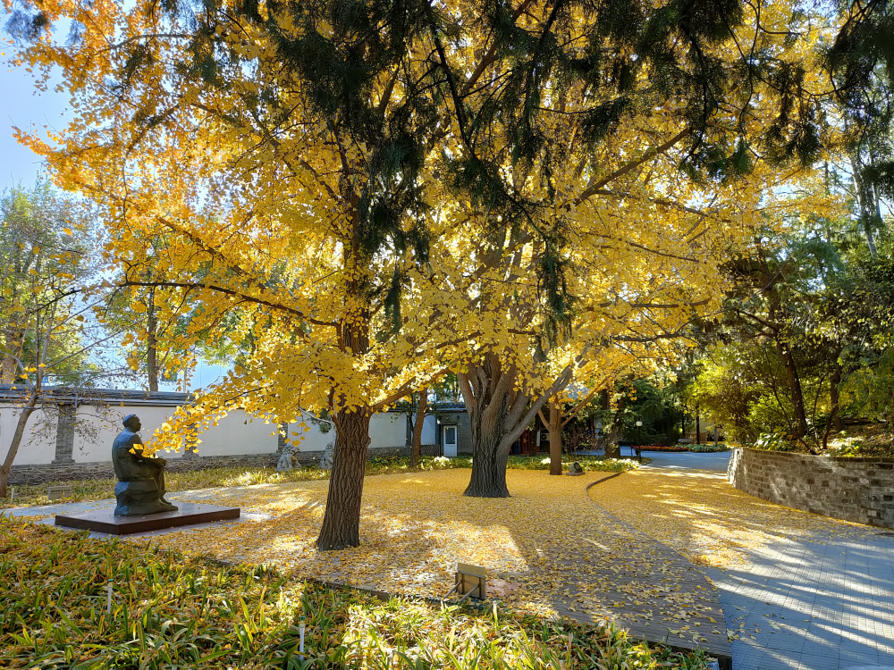 故居的院內矗立著郭沫若的雕像,盤膝而坐,似有所思的看著園中的銀杏樹。