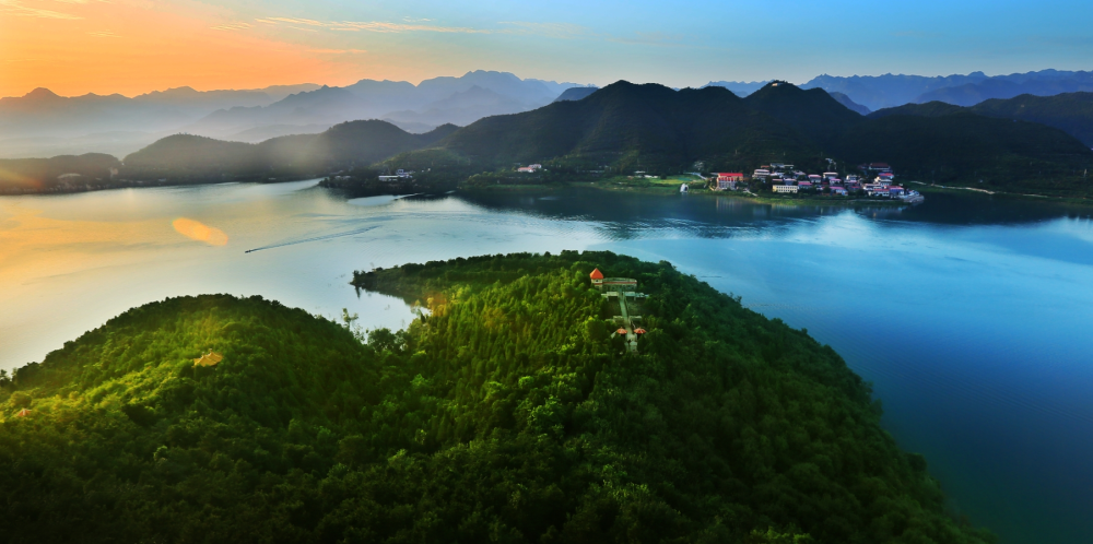 金海湖三麵環山,風景秀麗,有湖光塔、金花公主墓、望海亭、鋸齒崖等數十處景觀。