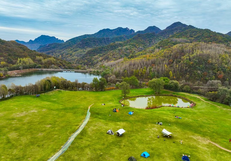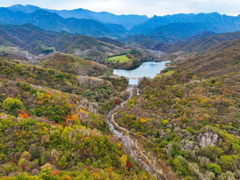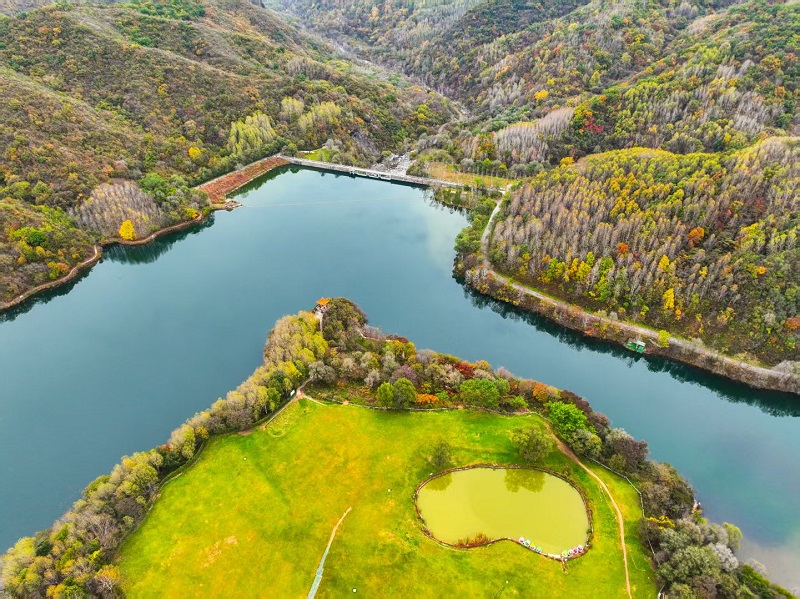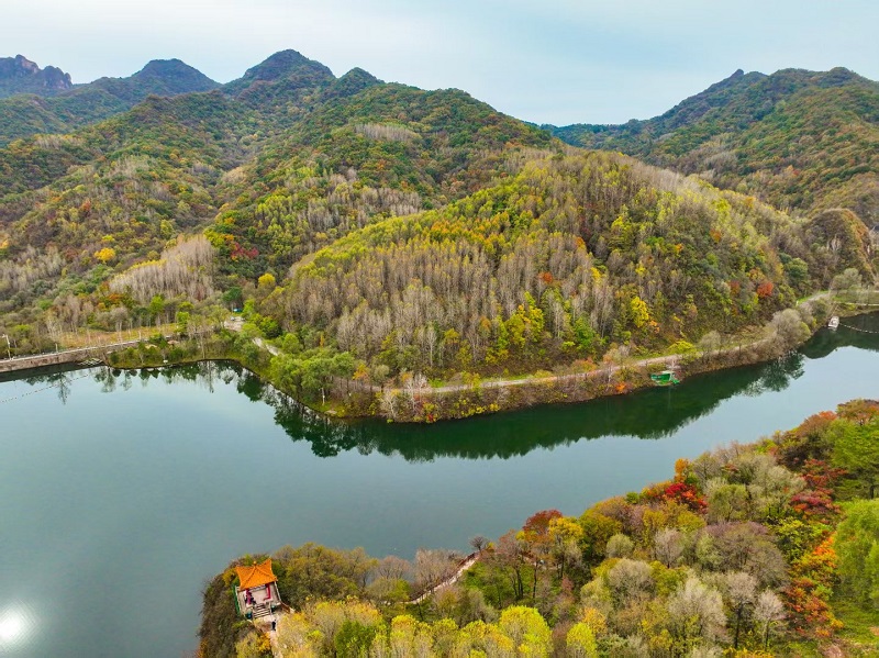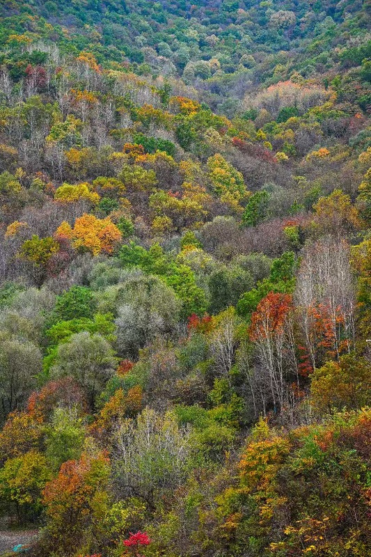 進入十月,玉渡山風景區已是層林盡染,山林色彩漸變交織,白樺樹的葉片變成了金黃色,落葉鋪滿了山間小路。在海拔1500米的森林裏,成片的紅葉為這幅秋日畫卷添上了迷人的色彩。山頂的草甸,視野開闊,遠處的群山連綿起伏,山上的樹木五彩斑斕。穿過山林,潺潺流水匯成碧綠的水潭,格外清澈,形成一幅“碧水映秋” 的絕美畫麵。