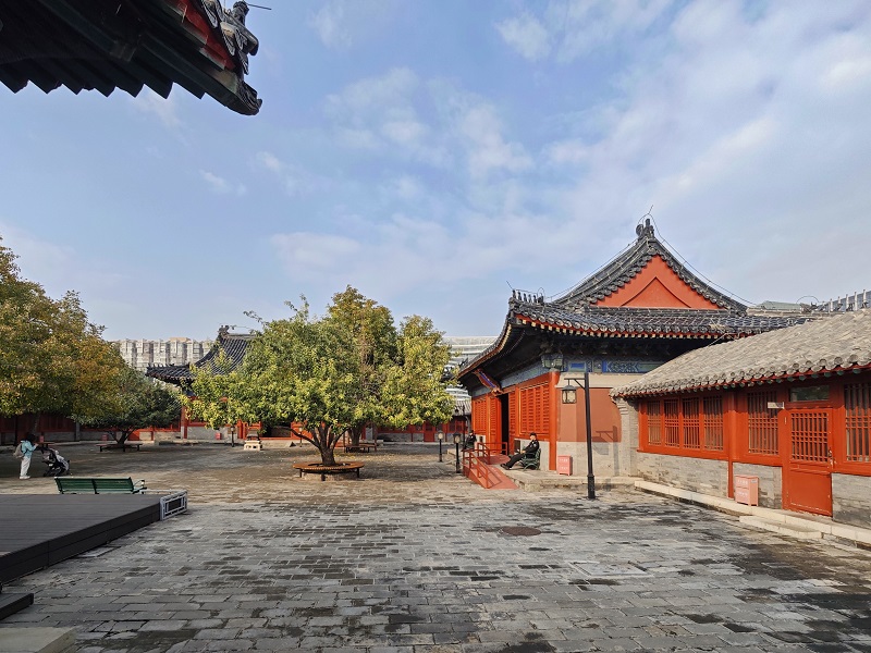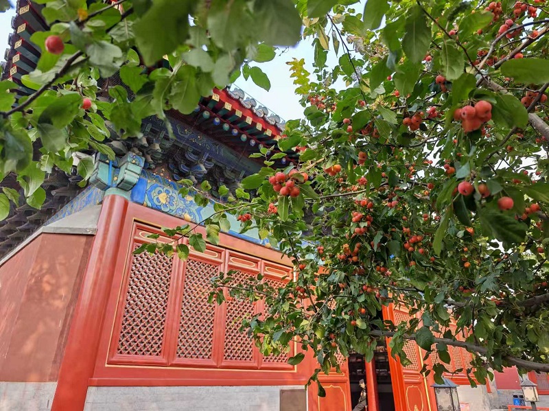 秋意已深,北京智化寺內,一抹豔麗的紅點亮了古老寺廟。在古寺一隅,一株百年海棠樹枝頭掛滿紅彤彤的果實,像繁星般閃耀,為寧靜的古寺添了幾分絢麗。