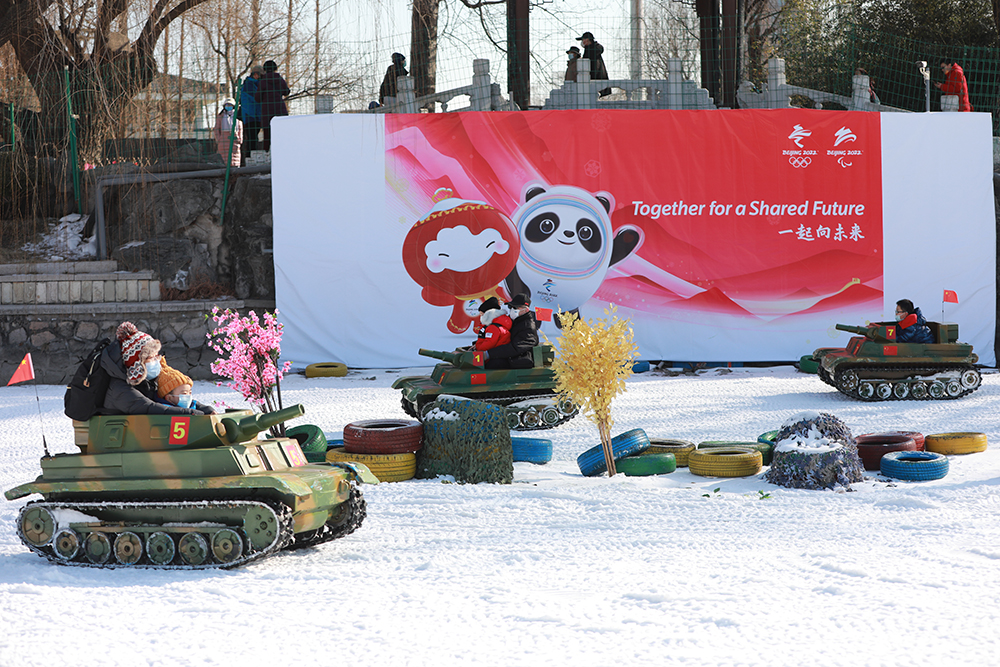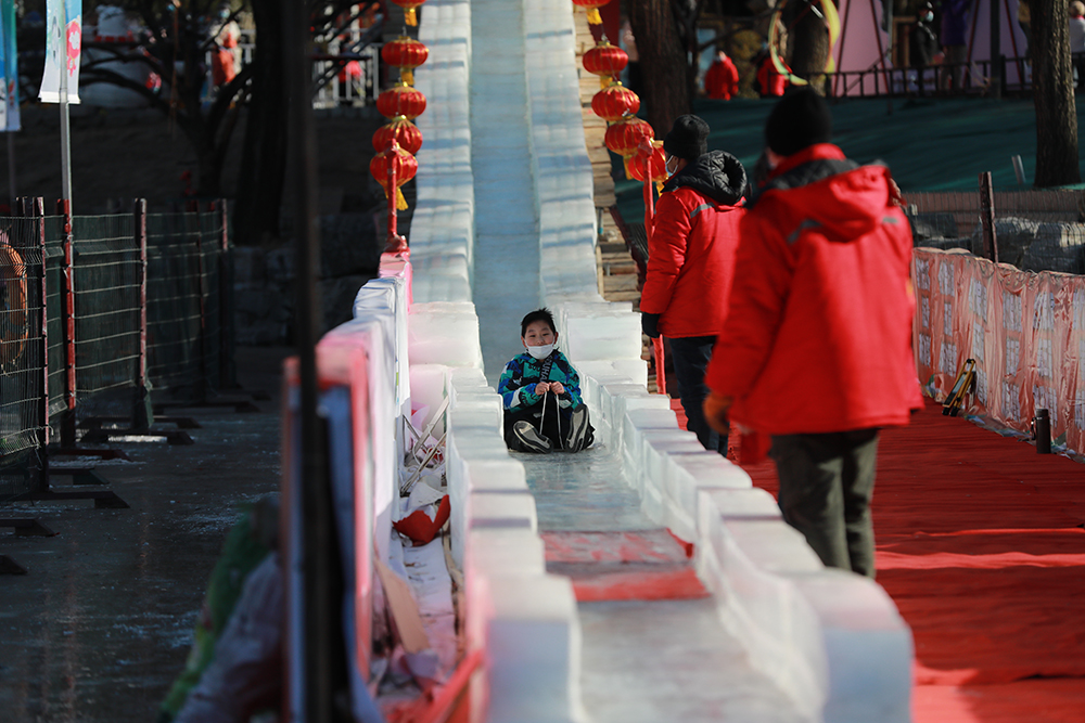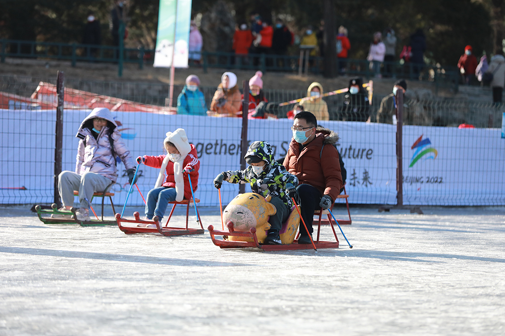 在紫竹院公園內,高6米、寬30米、長80米的雪山滑梯,遊客坐在雪圈上體驗雪上飛翔的刺激。雪地坦克 、卡丁車、雪國列車、動感悠波、回旋大冒險等8項經典雪上趣味娛樂項目,吸引不少市民遊客走出家門參與到冬季健身活動中來。據工作人員介紹,2022年公園利用北小湖打造出1.5萬平方米的人工雪場,同時,公園大湖、南小湖共計近4萬平米的天然冰場開展各類冰上健身活動。