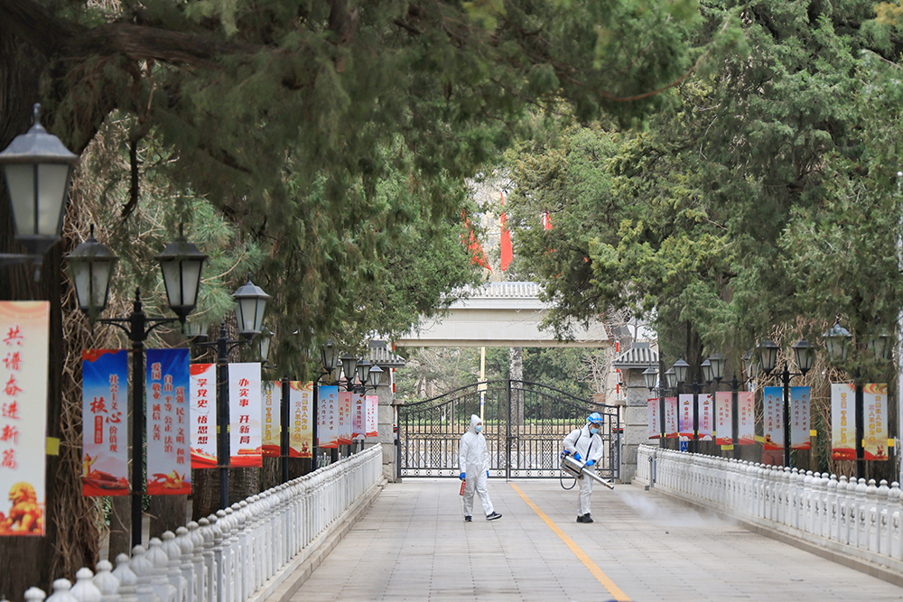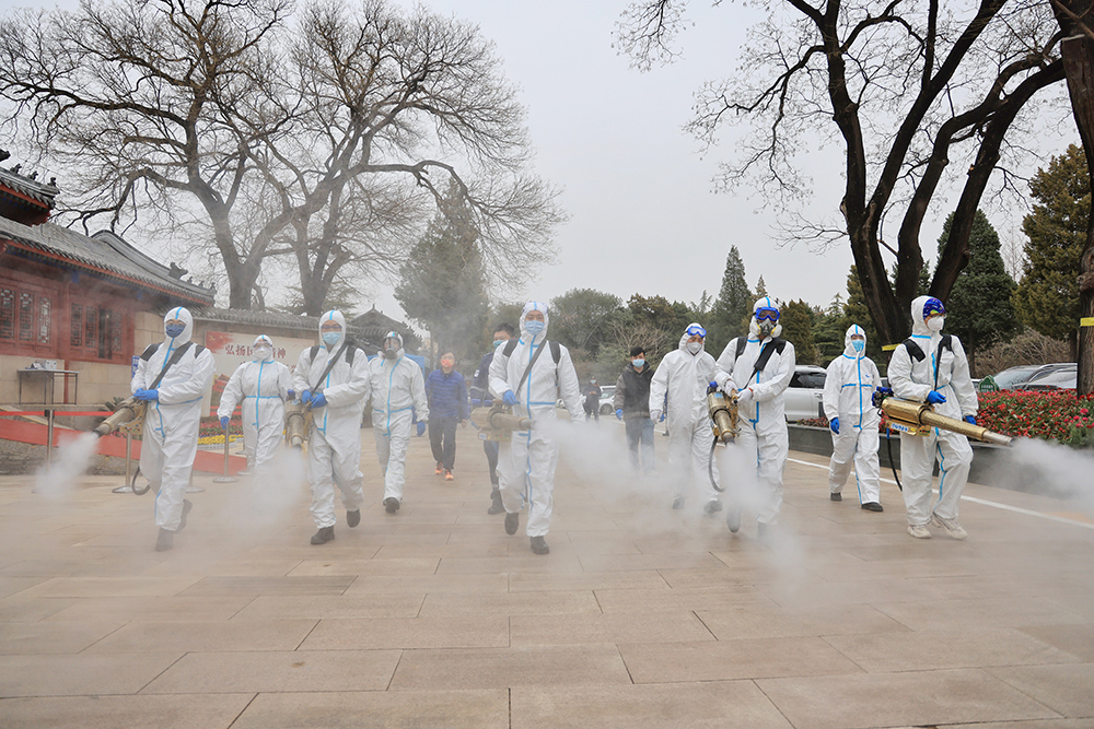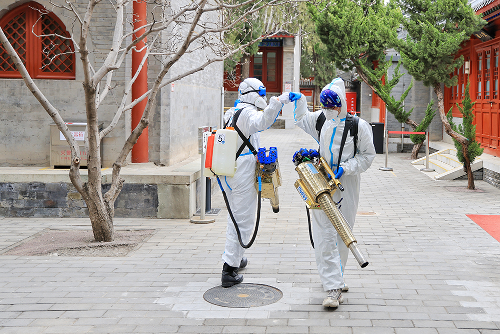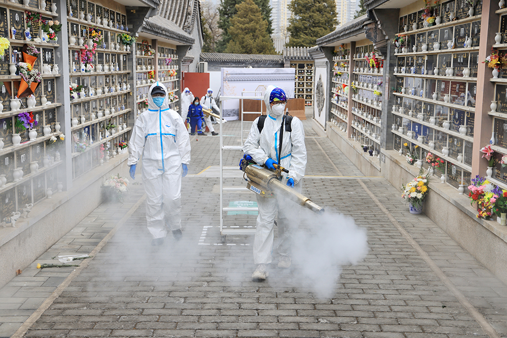 消殺現場,北京藍天救援隊的誌願者們身穿防護服、手拿彌霧機,背負水箱,對革命公墓公眾場所和重點區域實施消毒殺菌。