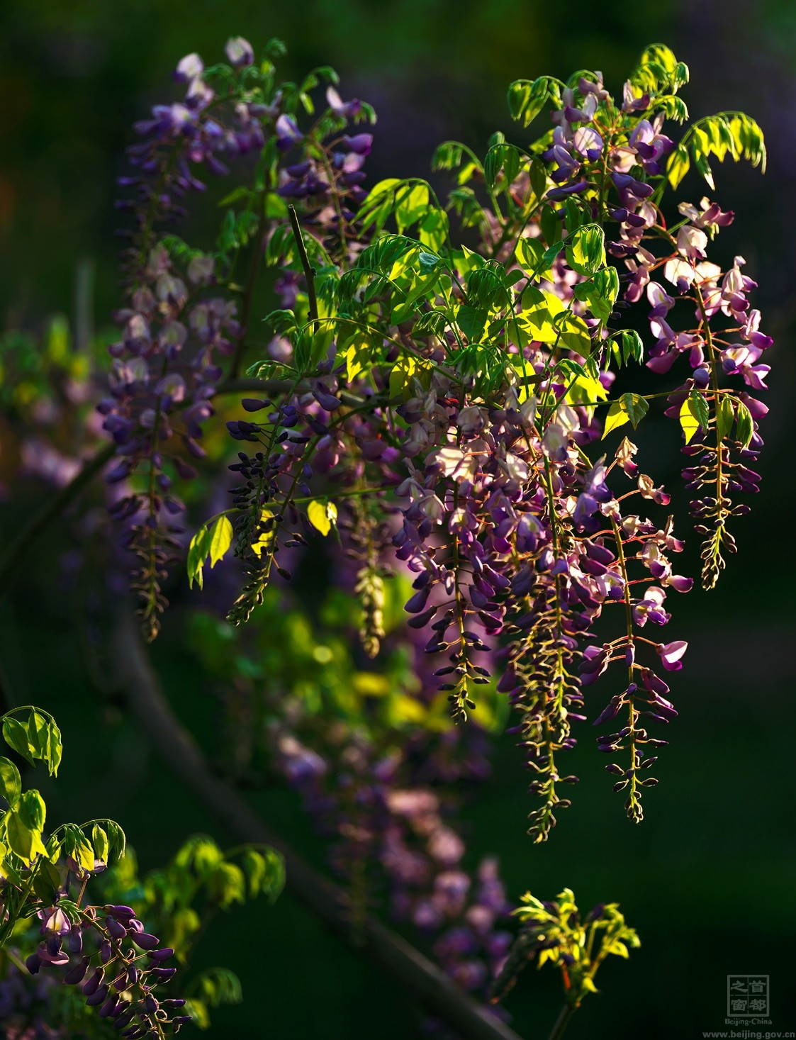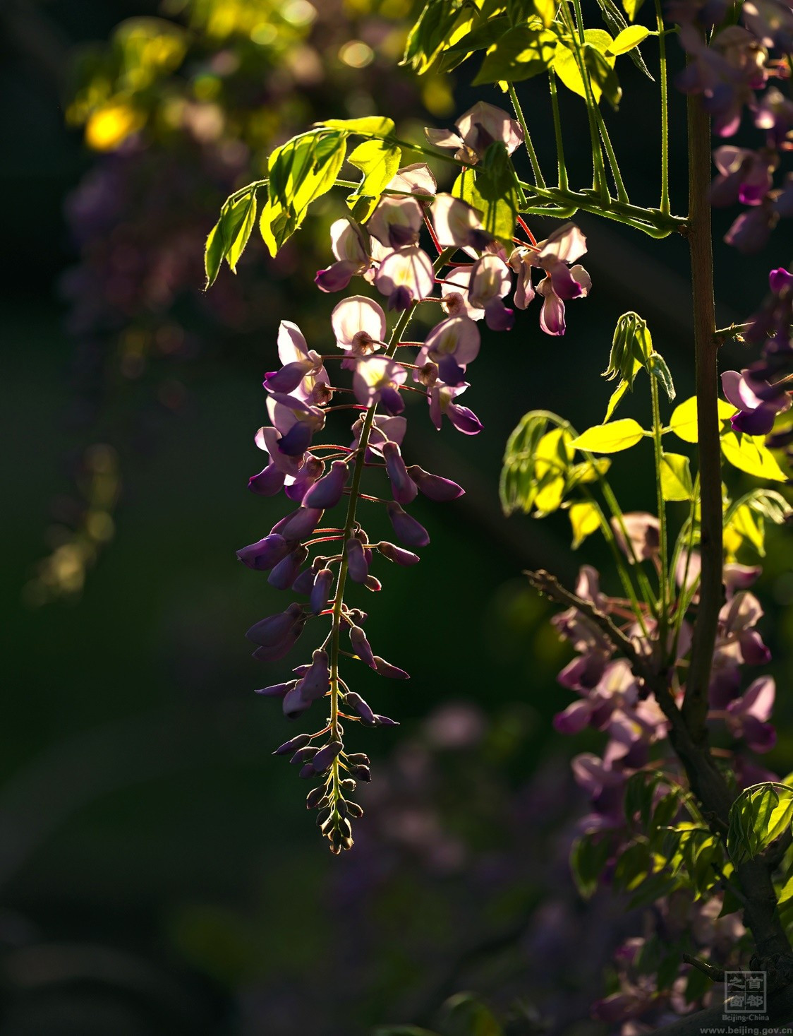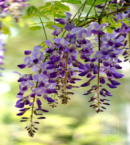 紫藤,又稱藤蘿、朱藤,屬豆科,高大木質藤本,是我國最著名的棚蔭植物。紫藤花三月現蕾,四月盛花,花型優美別致,是思念和幸福的象征。也正因紫藤花的寓意,很多人文都表達出了對紫藤花的喜愛。唐代詩人李白在《紫藤樹》中讚美道:“紫藤掛雲木,花蔓宜陽春,密葉隱歌鳥,香風留美人。”北京曆史上文人愛藤,他們不但在詩詞中詠藤,而且在自己居住的宅院中植藤。明代北京宣南地區海柏胡同(又名“海波胡同”,因有古刹海波寺而得名)的孔尚任居所自稱“岸堂”,孔公有句雲:“海筆巷裏紅塵少,一架藤蘿是岸堂”。