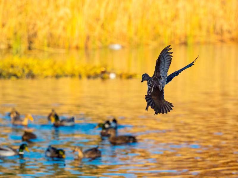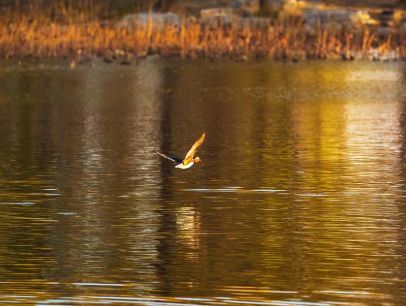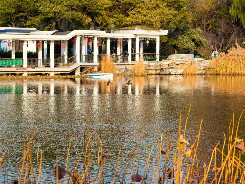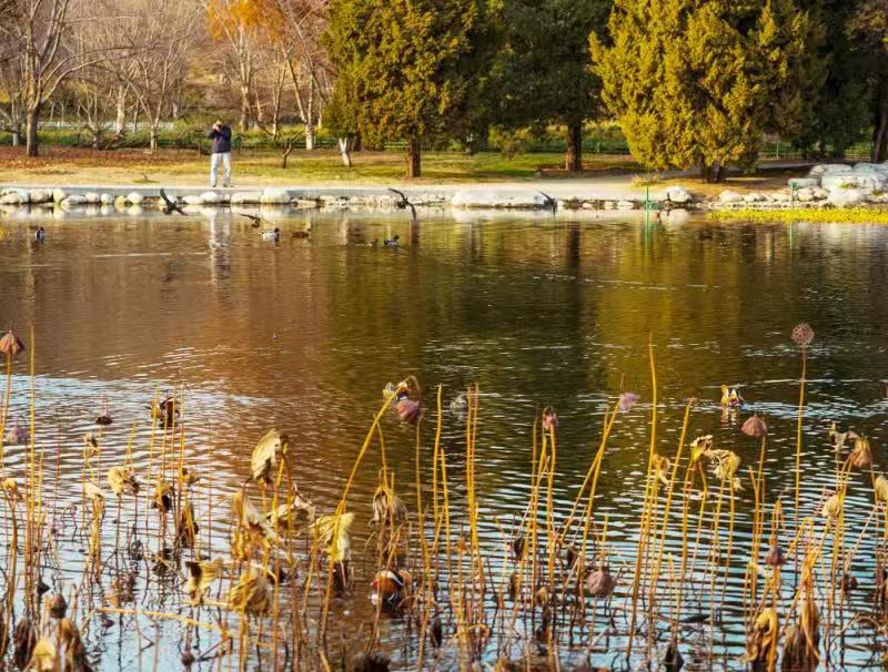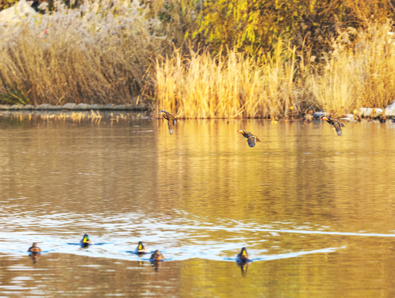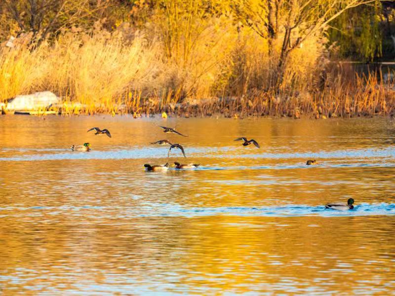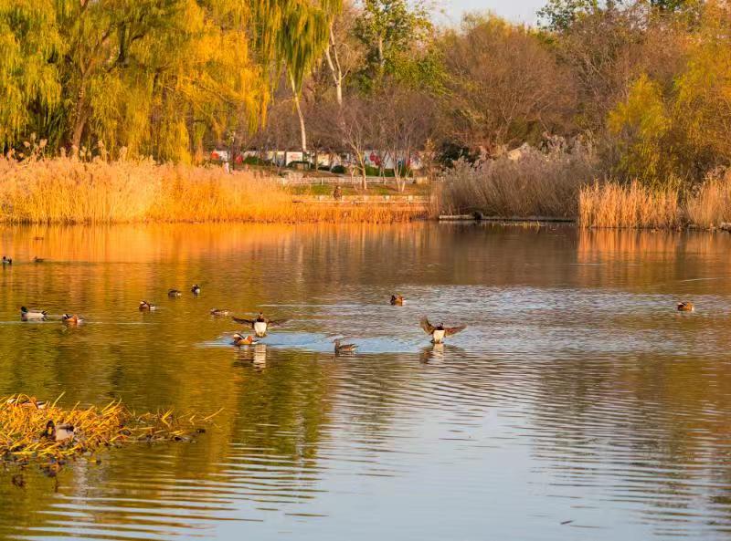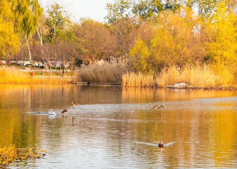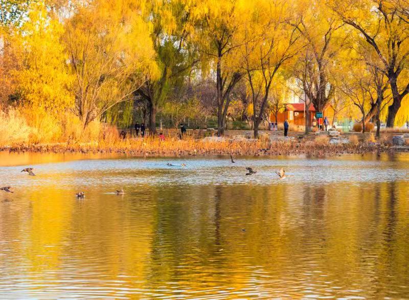 玉淵潭的櫻花湖候鳥群飛,在金色池塘中任意馳騁。