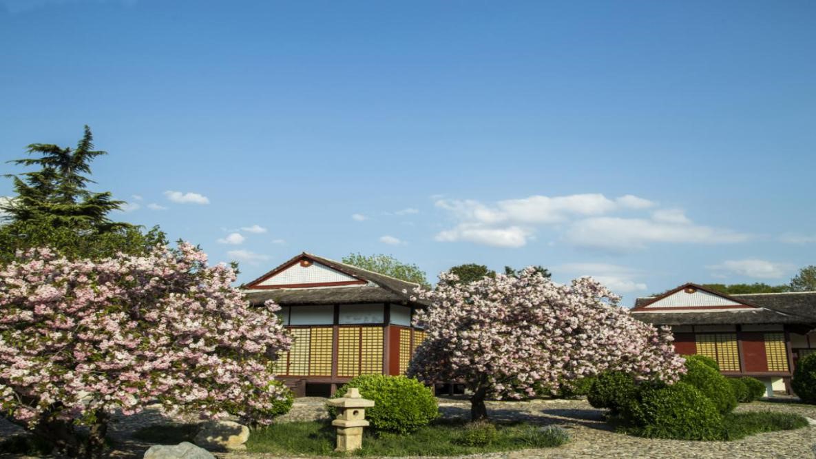 美麗的日本桂離宮在櫻花和藍天白雲的映襯下,猶如一幅美麗的圖畫。